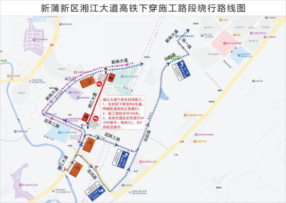 (二)远端交通组织:为了避免施工路段拥堵,途经湘江大道高铁下穿通道前往新南大道的车辆可提前从河滨路或站后路前往东联二号线、新南大道方向分流绕行。